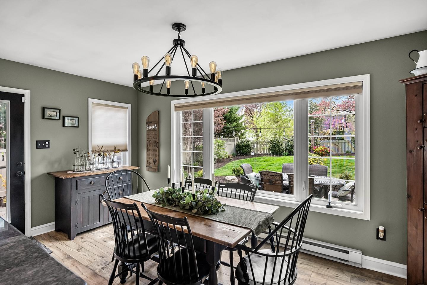 Toward the rear of the home, the updated kitchen blends character and function with built-in cabinetry, glass-front uppers, pantry storage, and newer Samsung appliances. It flows into a bright dining area where oversized windows overlook the backyard and flood the room with sunshine—an ideal setting for entertaining or everyday meals.