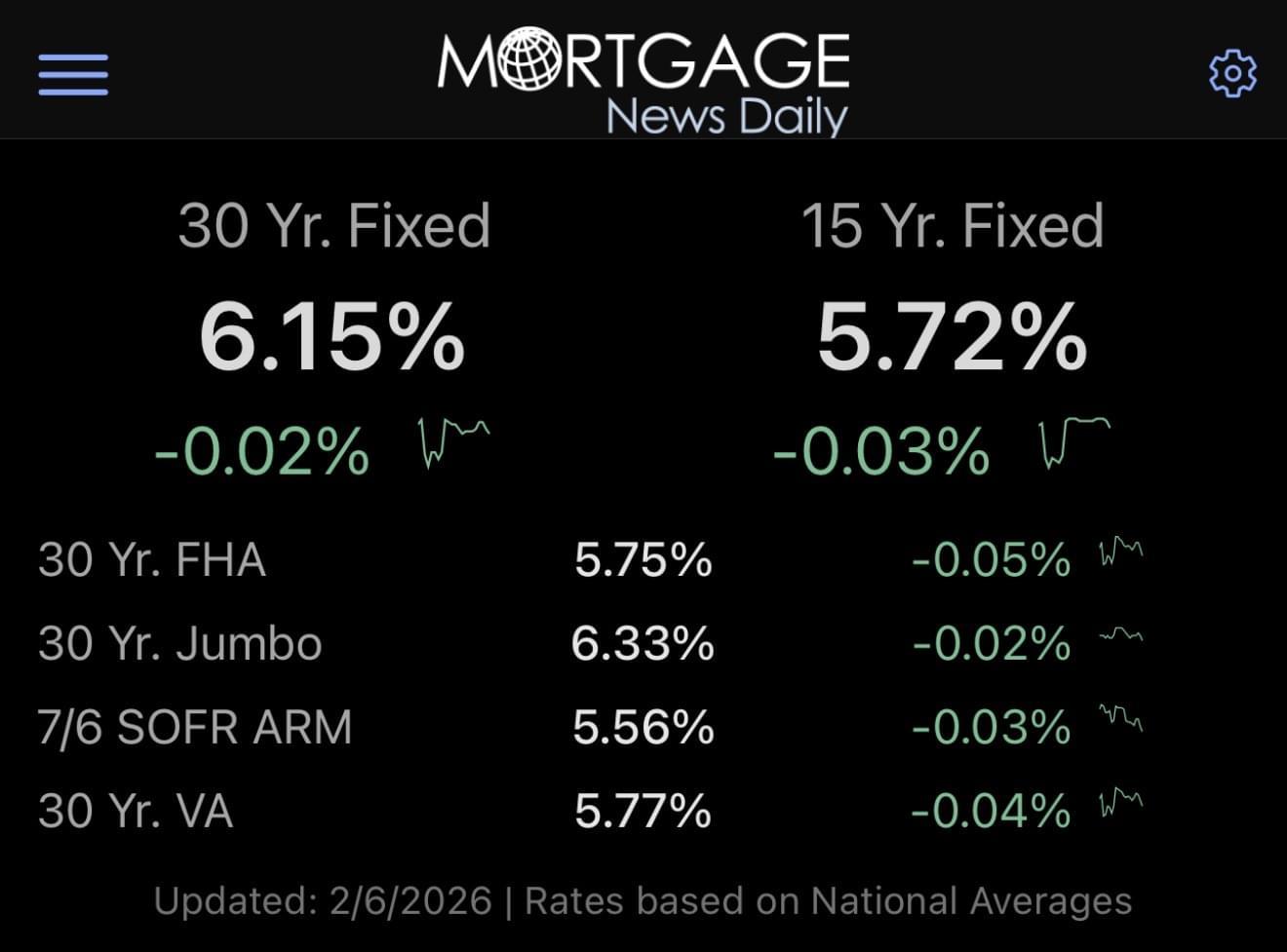 The average 30-year fixed mortgage rate sits between 6.1% and 6.2%, with the 15-year fixed just over 5.7%.